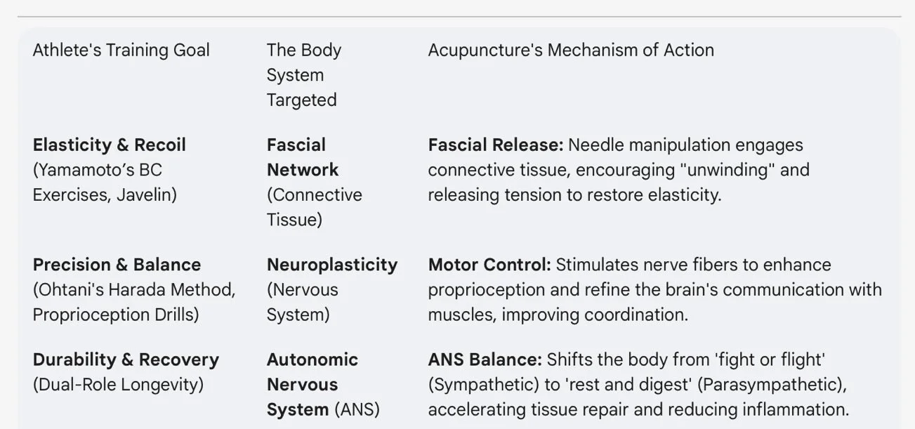 Acupuncture is not merely a tool for pain management; it is a neurological and connective tissue treatment that directly accelerates the same physiological processes Ohtani and Yamamoto seek to optimize through training. It acts as a targeted catalyst to enhance the three pillars of high-level performance: Recovery, Mind-Body Connection, and Nervous System regulation.